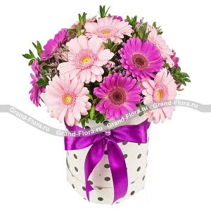 Встреча двух сердец - коробка с розовыми и малиновыми герберами