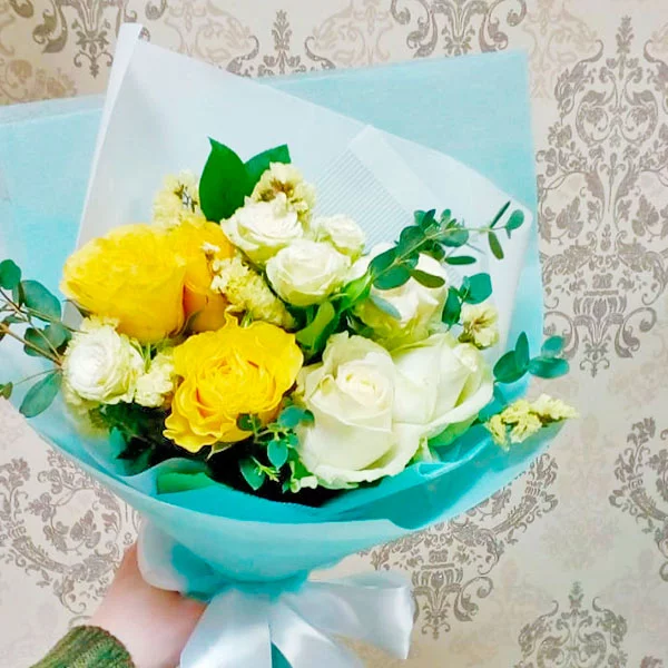 Уменьшенный: роза белая - 3 шт., роза желтая - 3 шт., роза кустовая желтая - 1 шт., декоративная зелень, упаковка, лента. *Возможна замена кустовой розы на один оттенок (только белые или только желтые),декоративная зелень может отличаться от фото.